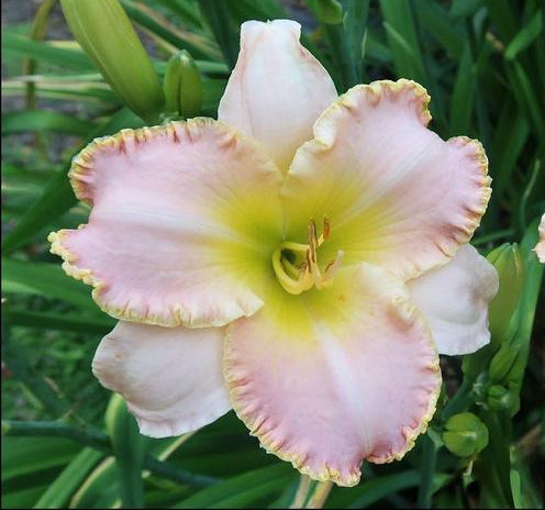 Peony pink with a clean yellow edge above a green throat.