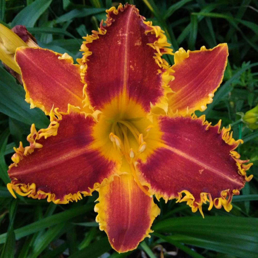 This is one daylily you do not want to let out of your sight. With its impressive 7.5 Inch bloom that extends into golden teeth and blood red face with a darker watermark that surfaces a striking yellow throat.