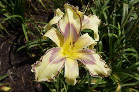 Soft lemon meringue pastel with a burgundy lavender eye above a yellow green throat, double edge of burgundy with outer gold teeth on both petals and sepals.