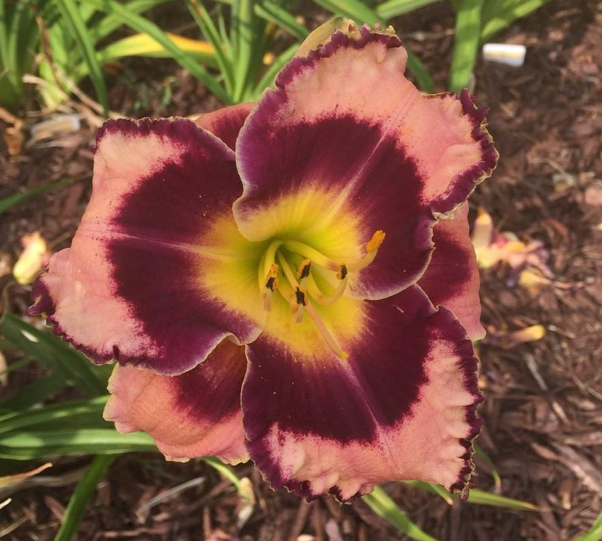 Pastel orange with dark almost black eye and matching ruffle, the sepals are a shade lighter but still have the dark eye.