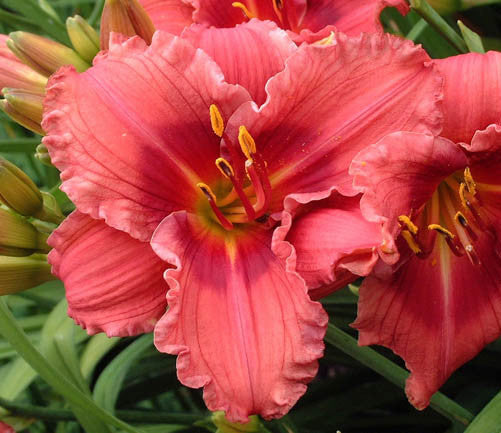 Deep pink that is paired with a red eye that matches the deep etched veins along the petals.