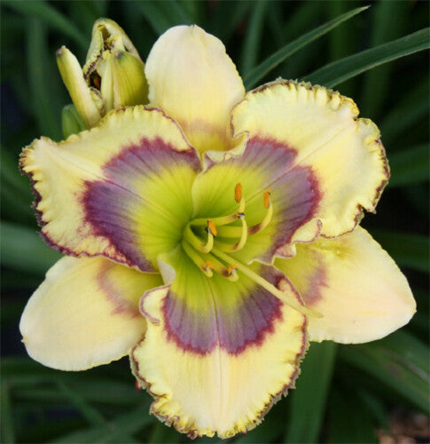 Bursting with an array of color, this daylily has it all. Pastel yellow face, purple eye, outlined in burgundy edge, lime green throat. With so many colors this will be compatible with whatever you already have in your garden.