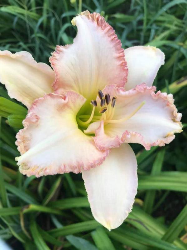 Silently showing off a cream pink flower that has a slight ruffle to have a soft texture. The yellow throat provides a change of color that creeps up into the face.