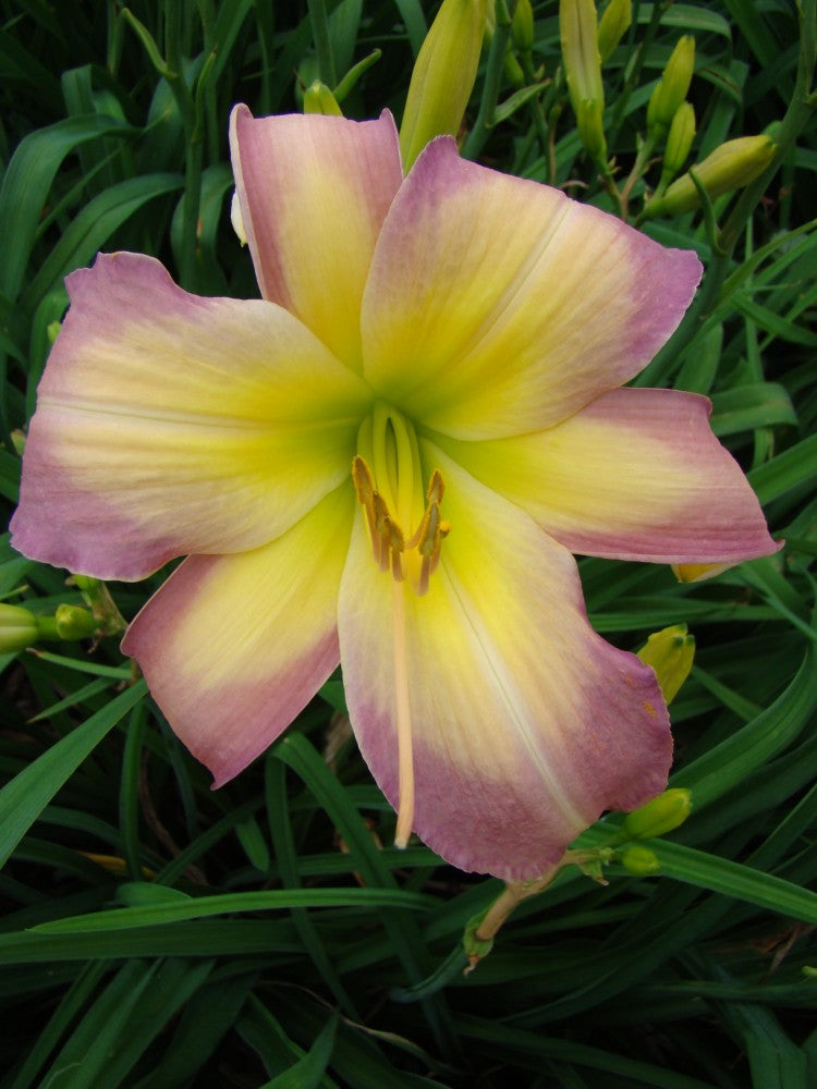 Pale lavender with a large watermark along the petals and sepals. The yellow green throat compliments the purple.