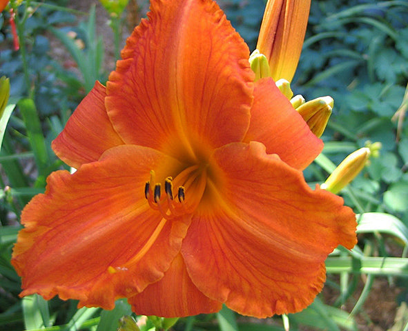 Spirit Fox is a reddish orange daylily with a yellow throat. Notes of lighter and darker orange appear throughout the petals.