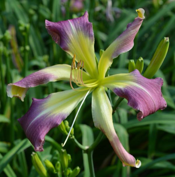 Tall with bold color that wisps in the wind. This violet with a grey watermark that has a green throat which winds up from the bottom of the bloom.