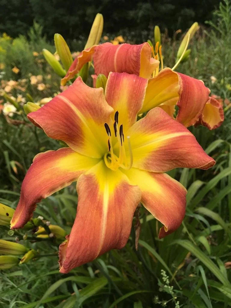 Tall burnt orange flower with a yellow green throat that cascades downwards to swing in the wind with grace.